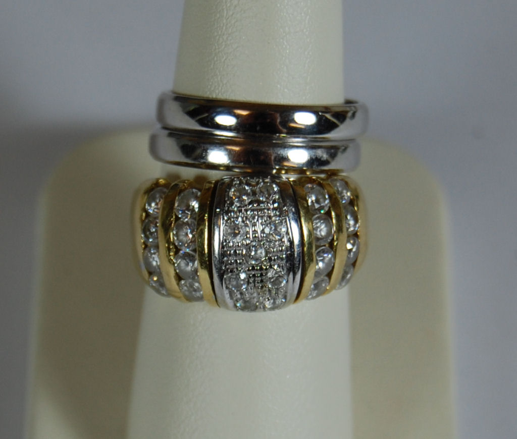 together with a colourless gem set ring, of bombé design, set with circular cut colourless gems, the two-coloured setting stamped 750 (3)