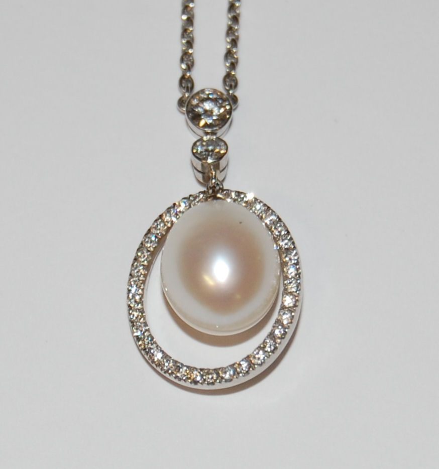 collet set to the centre with two graduated round brilliant cut diamonds, surmounting an ovoid cultured pearl, measuring approximately 9mm diameter, within an open oval border of round brilliant cut diamonds, the whole suspended from a fine belcher link chain, with hinged circular clasp