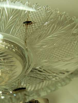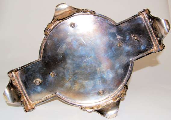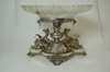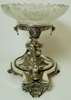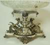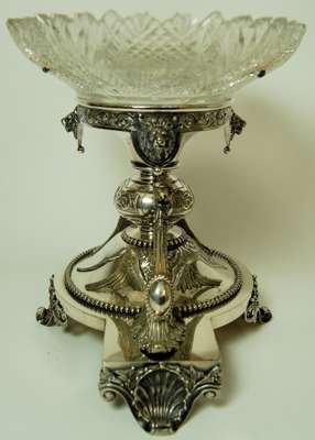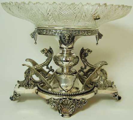 the shaped base raised on shell formed bracket feet with domed central support below a large knop with beaded borders and engraved decoration, supported by two reclining winged beasts, the whole supporting a cut glass oval bowl (A/F)