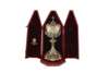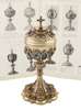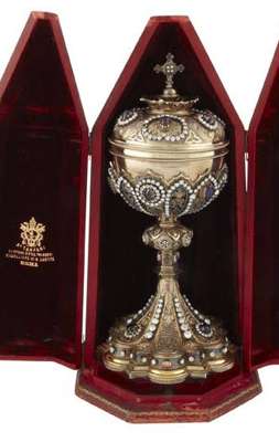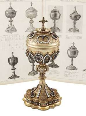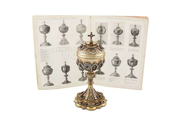 the ovoid bowl overlayed with pierced scalloped panels with alternating designs of fruiting vines or foliate details, the outer borders formed with collet set colourless stones, with opposing panels of cabochon and pear shaped stones, the pull off domed cover with central crown with cross final, the cover with chased foliate designs and gem set cartouches, the whole raised on a hexagonal gem set stem with compressed baluster pearl set knop; the lobed spreading foot with graduated borders of colourless gems and with finely chased fruiting vine and acanthus decoration with armorial and gem set panels, contained in original fitted gilt tooled case