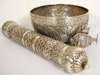 to include; an unmarked scroll case with embossed and pierced decoration, with domed terminals and pull off cover; a novelty box naturalistically formed as a fish, with fine embossed detail and hinged cover; and a finger bowl with chased floral and decoration and geometric borders (3)