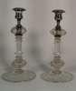mounts unmarked, the cylindrical stem with spiral knop above and simple baluster knop below, each with applied prunts and flowerheads, the whole raised on a spreading domed foot with reeded edge (2)