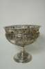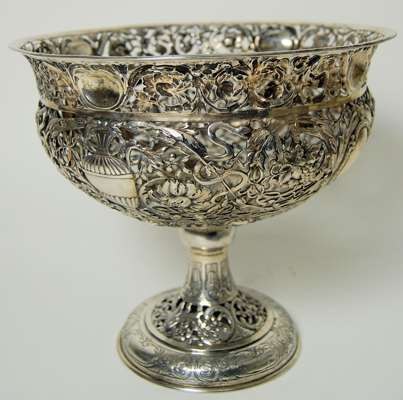 the deep bowl with everted rim and heavily pierced decoration of foliate and trailing fruiting vines, with alternate urns and vacant cartouches, raised on simple stem with chased details and on spreading foot with pierced and chased decoration