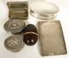 to include a finely engraved cigarette case, marked 800, with foliate borders and engine turned decoration; an oval dressing table box by Goldsmiths Company London 1929; a Continental oval box apparently unmarked, with embossed hinged cover with love birds within ribbon and floral borders; an unmarked Continental snuff box with embossed courtly scene; a William IV snuff box, with moulded border and engraved decoration (a/f) and a wooden egg with screw off section (6)
