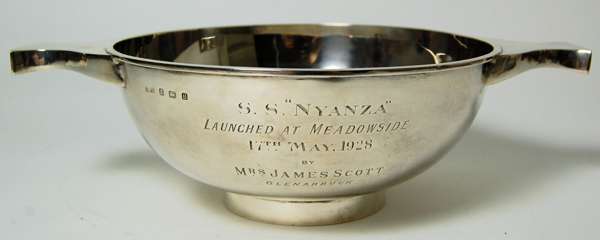 retailed by Laing (of Glasgow), Birmingham 1926, of typical form with twin waisted lugs and raised on simple collar foot, to body engraved 'SS Nyanza launched at Meadowside 17th May 1928 by Mrs James Scott Glenarbuck'