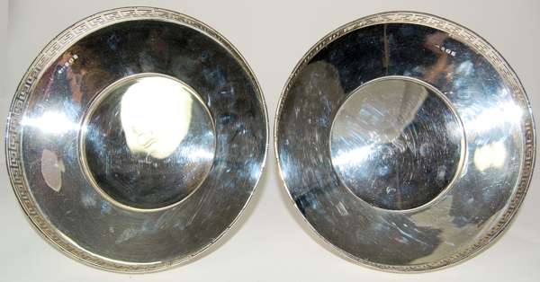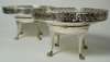 Birmingham 1910, the shallow circular bowl with central well and raised greek key pierced border, on simple bases with four legs with bracket and paw terminals (2)