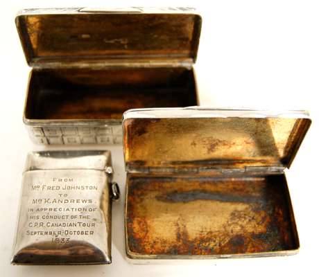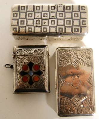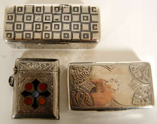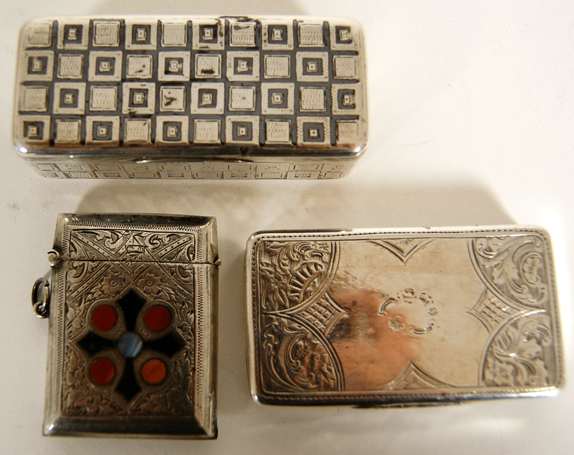 Birmingham 1919, the rectangular vesta with foliate engraved decoration within lattice work borders, the front panel set with hardstones and agates in a cross motif; together with a continental snuff box and a Russian niello decorated snuff box with indistinct marks (2)