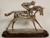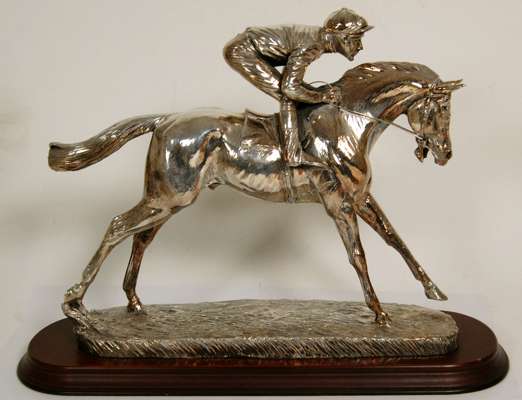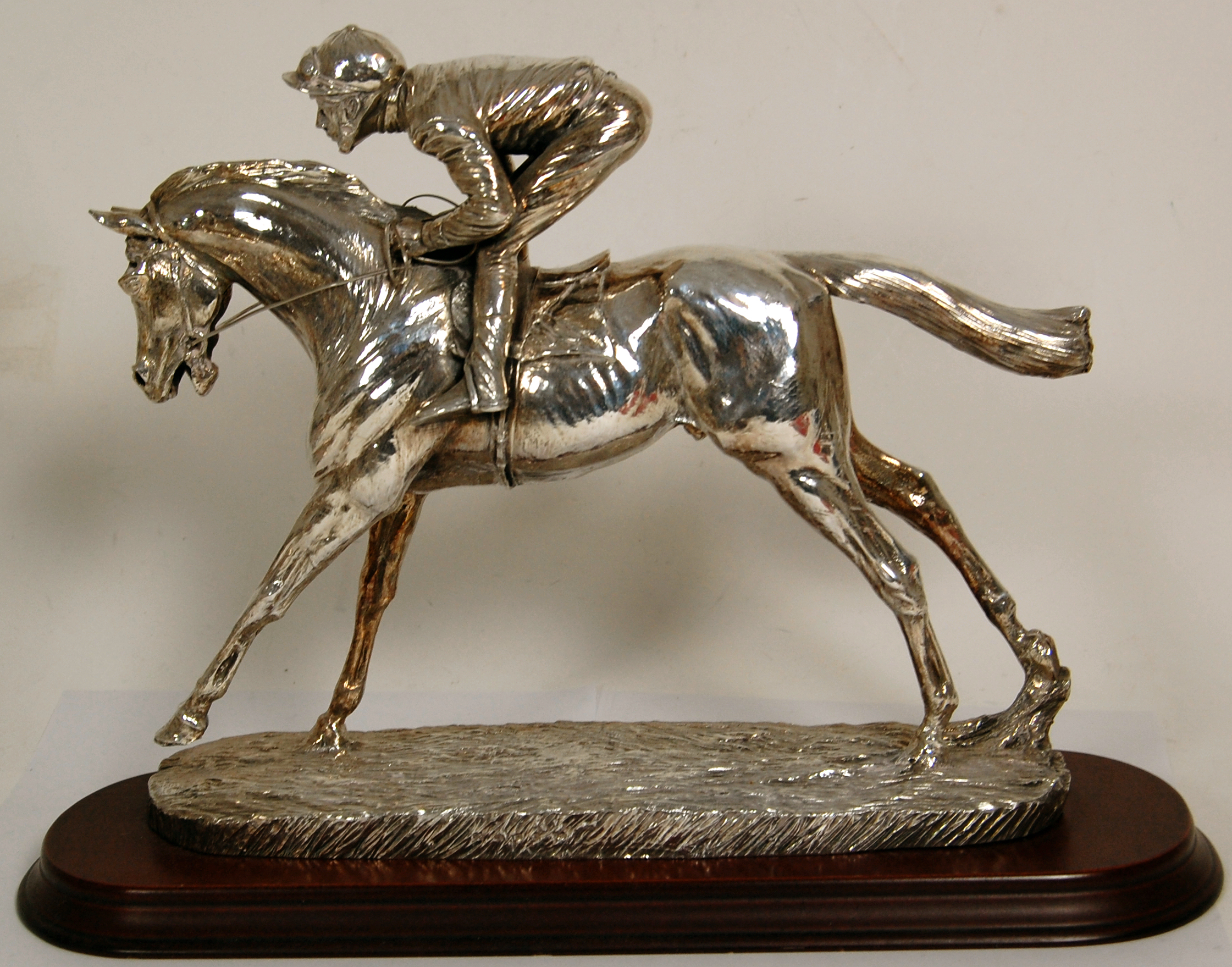 Sheffield 1997, the horse in racing pose with jockey, naturalistically formed and on textured base, the whole raised on a wooden plinth