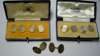 retailed by Mappin & Webb, the terminals of square form with rounded corners with all over engine decoration, with chain connections; together with a pair of 9ct gold oval terminal cufflinks with engraved crests and a pair of 9ct gold rectangular cufflinks with engine decoration terminals