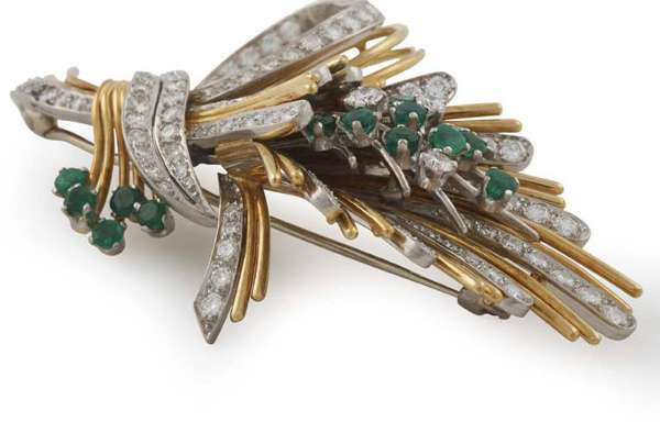 of asymmetric stylised foliate spray design, claw set with graduated circular cut emeralds and round brilliant cut diamonds amidst scrolling borders of similarly cut diamonds