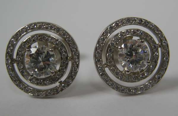 each claw set to the centre with a round brilliant cut diamond, within two open borders set with smaller similarly cut diamonds, with post and butterfly fittings, estimated principal diamond weights: 0.44cts and 0.44cts
