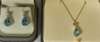 a pendant of claw set tear shaped aquamarine with circular brilliant cut diamond and a fine link neck chain, together with a pair of matching ear studs, the diamonds collet set