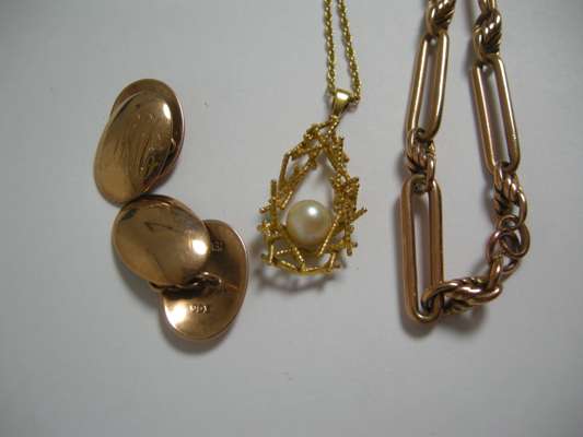 a 9ct gold fetterlink Albert, a pair of 9ct gold cufflinks of oval domed shape chain links, a modern gold pendant with a cultured pearl suspended in an abstract frame, trace link chain
