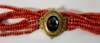 the oval pietra dura panel mounted in gold decorated with cannatille work, with a quadruple strands of coral beads
