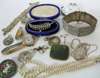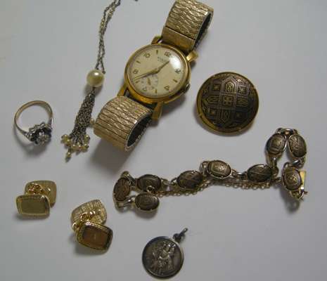 and a group of jewellery to include; a gold framed moss agate brooch; an opal and pearl set fly brooch; an Edwardian pearl set pendant brooch; a George IV enamelled crown coin as a brooch; a silver cased and other pocket watches; two silver school sports medals and other lesser general jewellery