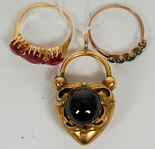 to include a Victorian heart shaped clasp collet set with an oval cabochon cut garnet within a scroll surround, with circular glazed locket to reverse; a three-stone ring, set with graduated synthetic rubies; also a five-stone ring, set with graduated circular cut green pastes, with closed back setting, initialled in script (3)