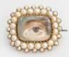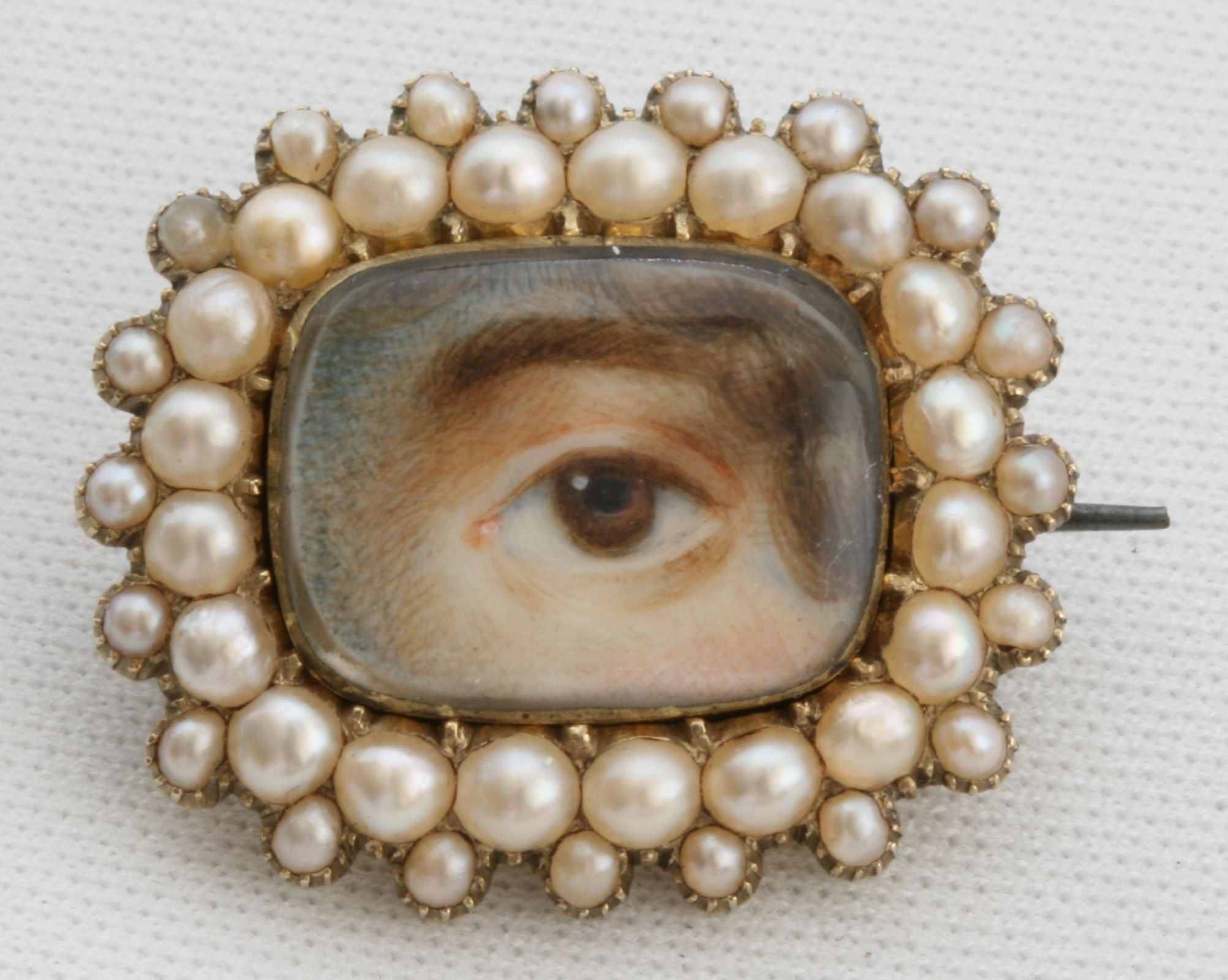 the central panel of a well painted lady's eye on ivory within a double border of pearls, enclosed back setting with pin fitting