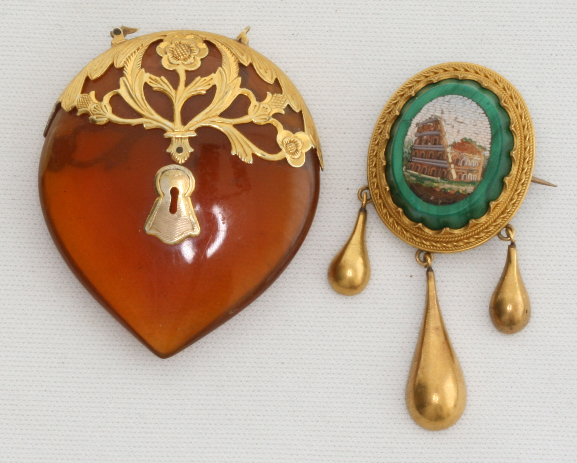 the mounts engraved and in a foliate design, a brooch set central malachite and micromosaic panel with rope work border and three gold drops