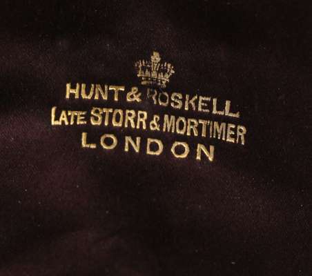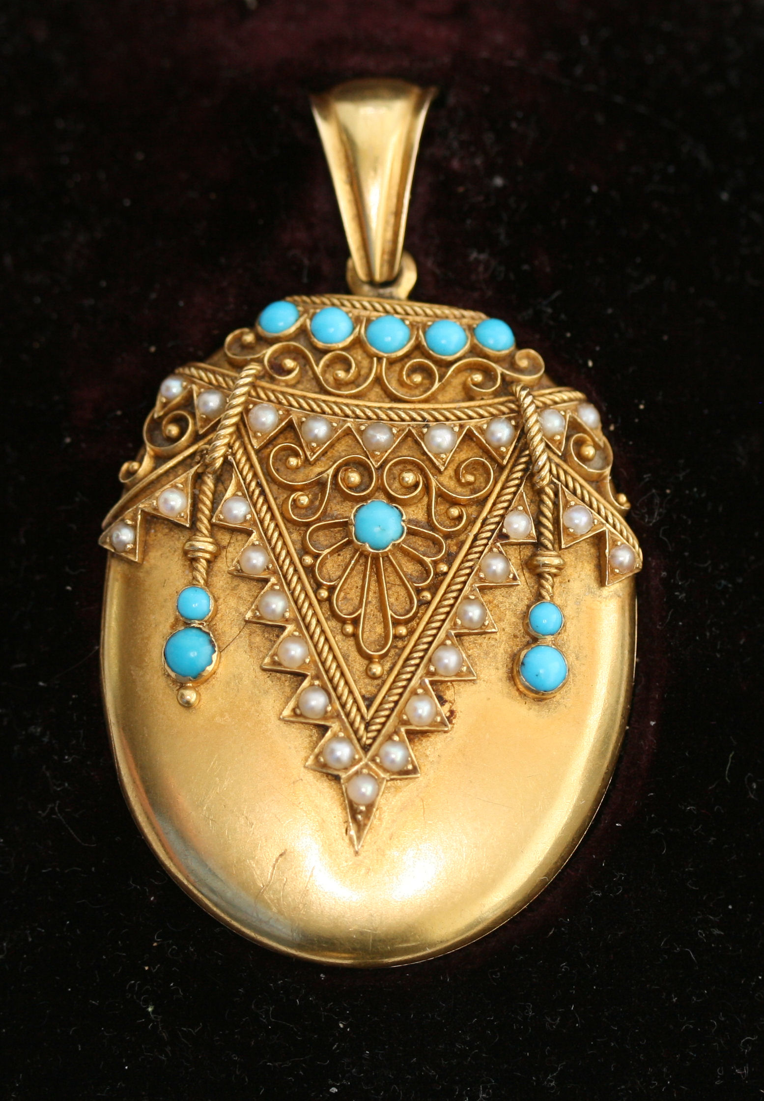the oval locket with a cannatille onset panel set half pearls and turquoises, moulded bale and in a fitted box for Hunt and Roskell