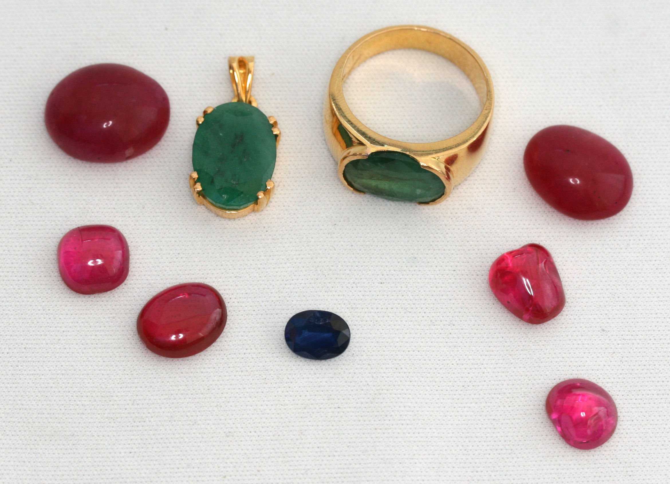each set with an oval cut emerald, ring stamped CT22 (both settings test as gold); together with a collection of seven loose gem stones including an oval cut sapphire (9)