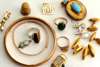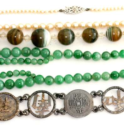 a gold bangle; pairs of gold cufflinks; agate and hardstone bead necklaces; Chinese silver belt; gold pin brooch; art deco gold watch head; thimble etc (Qty)