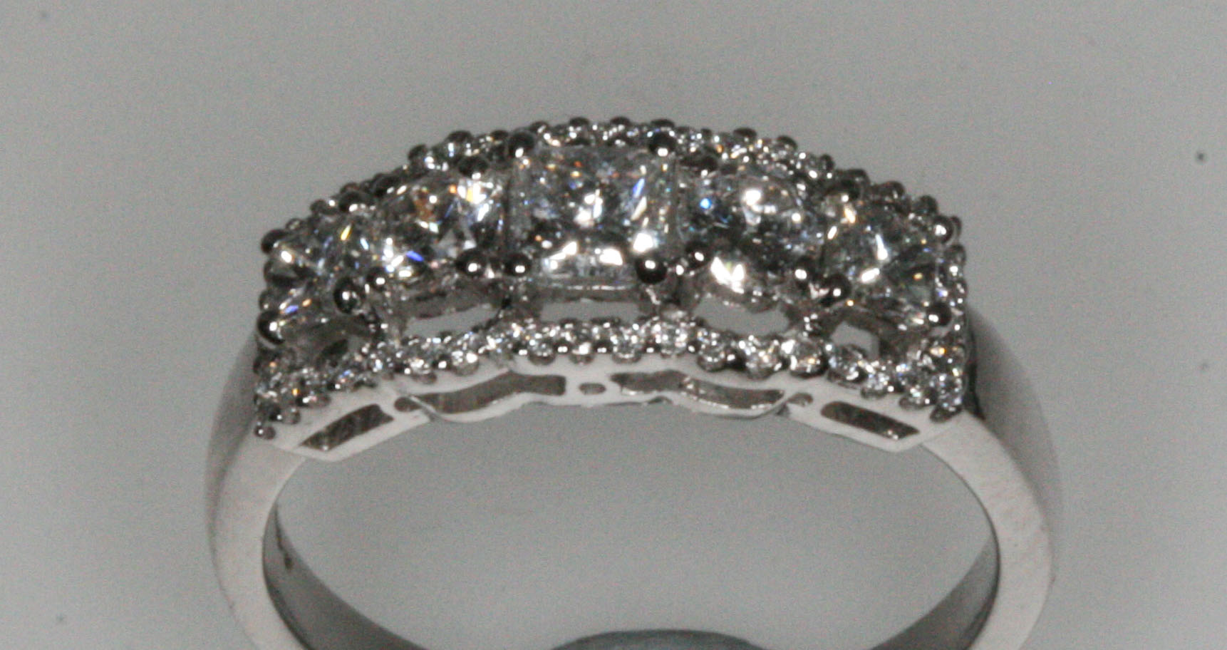 the central row of three graduated princess cut diamonds and two circular cut diamonds with an outer border of circular cut diamonds