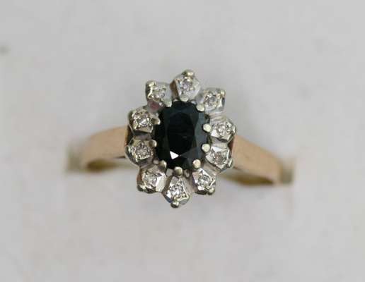 the central raised circular brilliant cut diamond with two borders each of six and twelve circular brilliant cut diamonds claw set in platinum, 18ct yellow gold shank, together with a sapphire and diamond cluster ring, the oval sapphire with illusion set border of diamonds