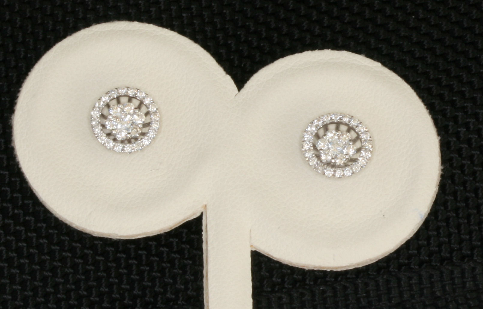 each set to the centre with a floral cluster of seven graduated round brilliant cut diamonds, within an open circular outer border set with similarly cut diamonds, with post and butterfly fittings, stamped 18K