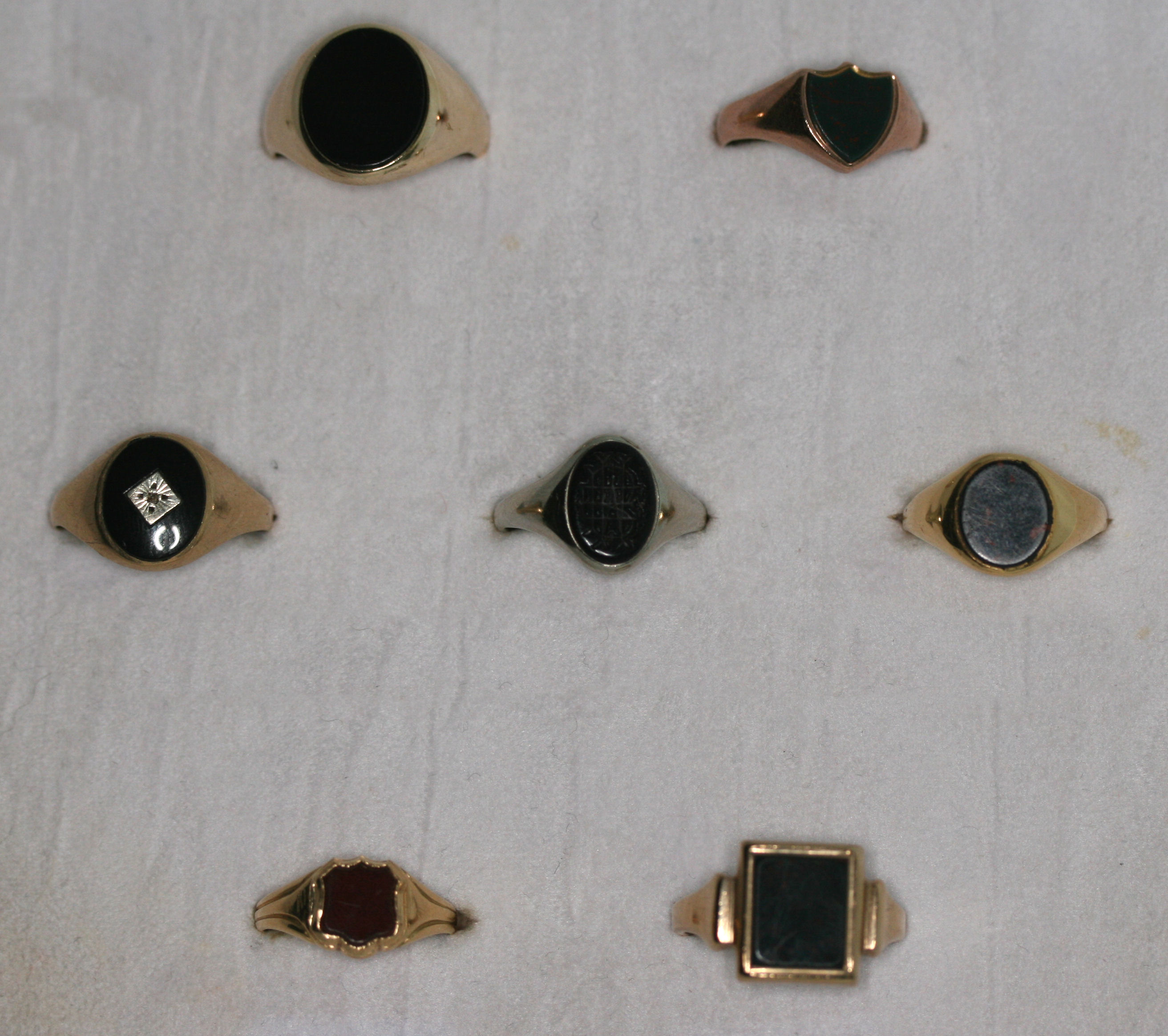 to iclude two hallmarked 18ct examples; four 9ct hallmarked examples, and one unmarked, all set with hardstone (all plain except one carved) in varying sizes and shapes (7)