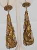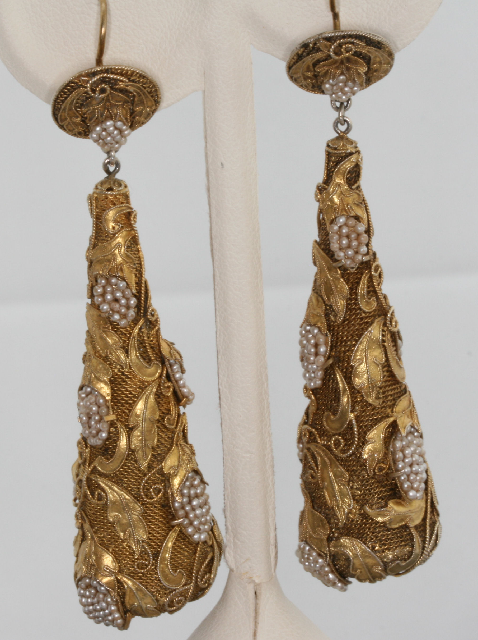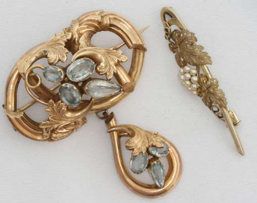 of bold leaf clasped scrolling form set pale blue stones and with a drop suspension similarly set, together with a gilt and costume pearl set brooch and pair of large drop earrings decorated with applied wire work