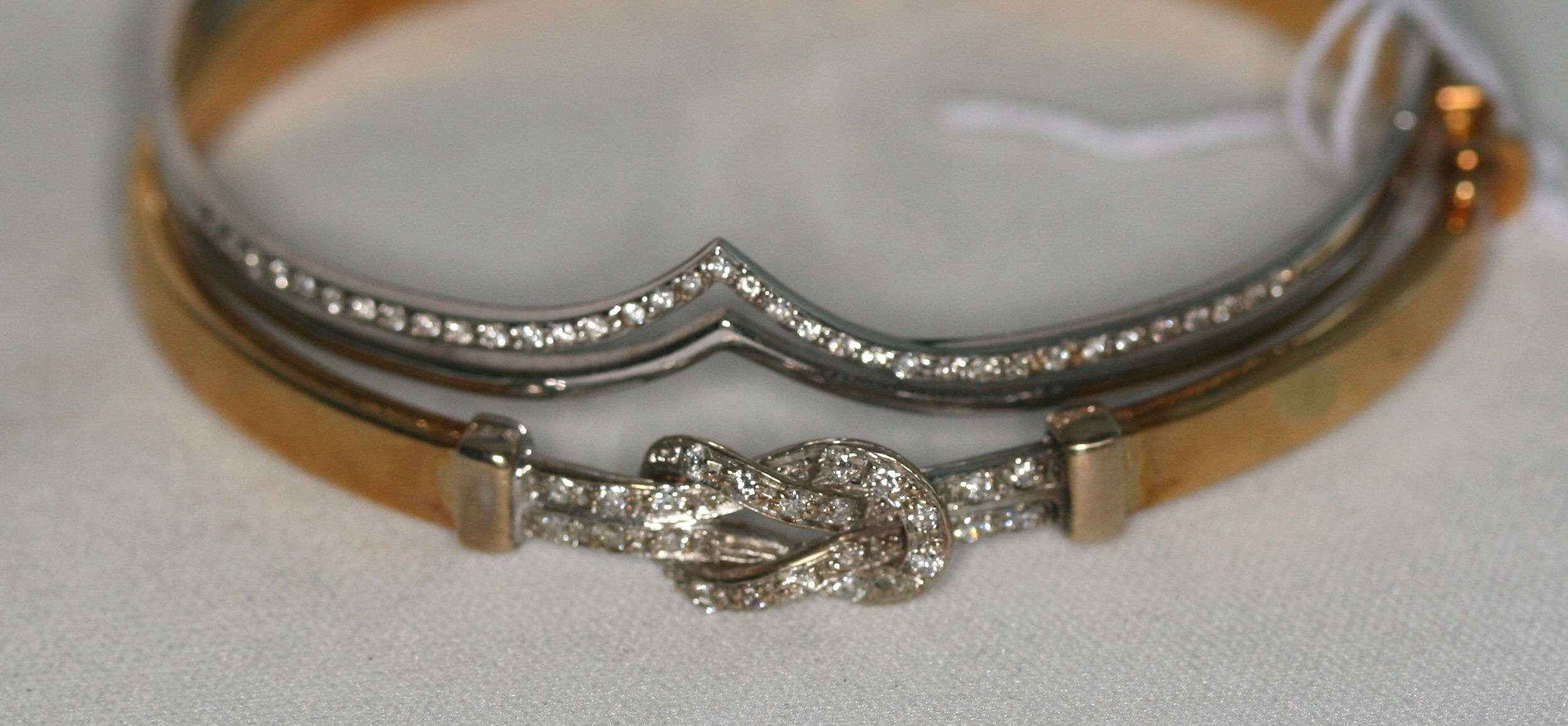 with white gold central section formed as a knot set with round cut diamonds; together with an 18ct white gold hinged bangle with simple trace set diamonds (2)
