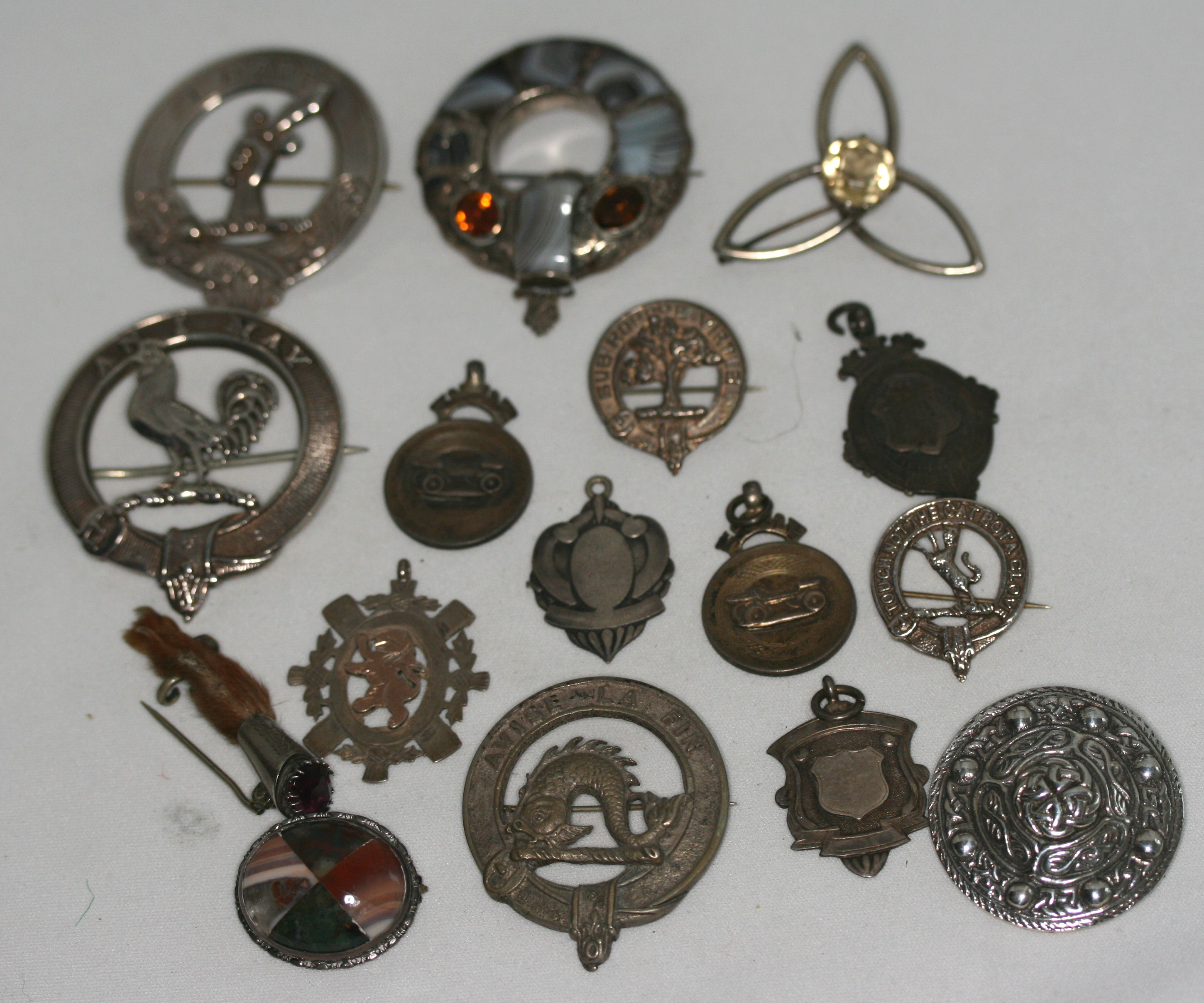 to include a large clan badge by PH, Glasgow 1936; an agate set garter brooch; various smaller clan badges and a group of silver fobs (qty)