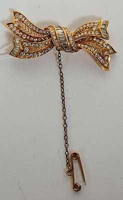 of pierced scroll design, det with millegrained borders of graduated baguette and round brilliant cut diamonds, setting stamped 750