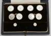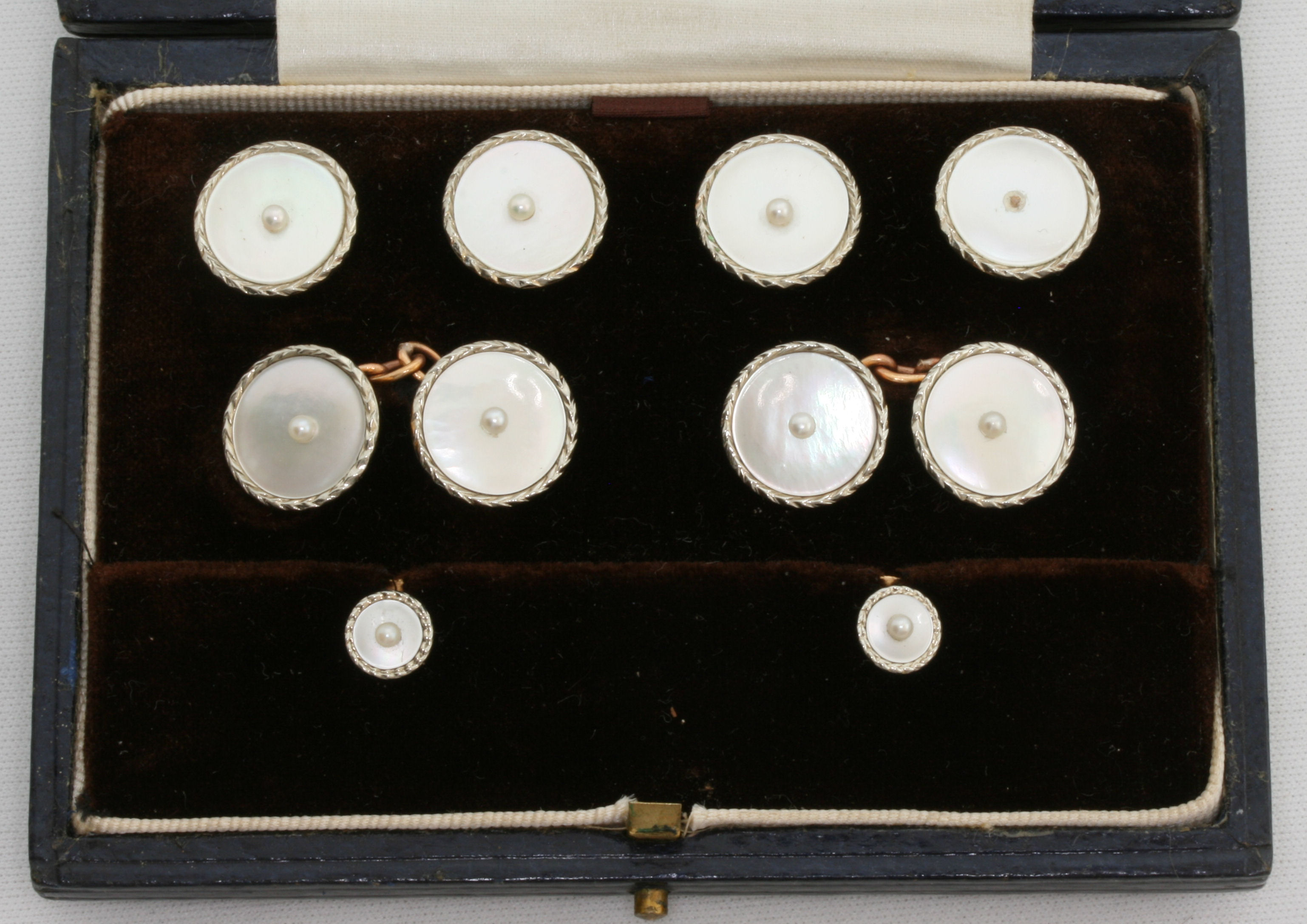 the circular studs with 18ct white gold border, surrounding mother of pearl ground with onset seed pearl, the set comprising four large studs, two small and a pair of cufflinks to match, all in a Wilson and Sharp box