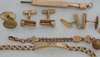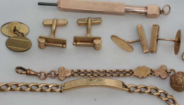 inclding a pair of gold cufflinks with applied auctioneers gavels; an oval pair; a small lapel Albert; an ID bracelet; a propelling pencil and another pair of cufflinks