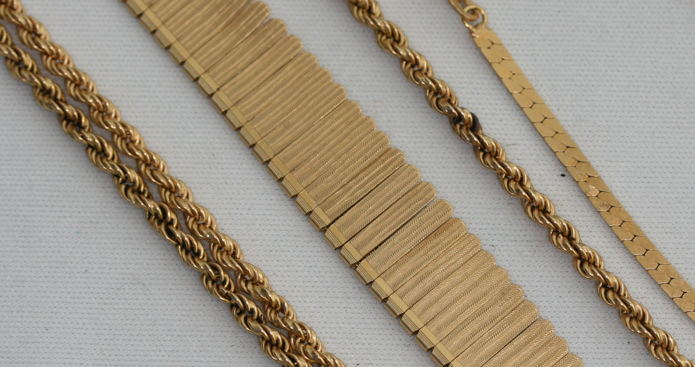 stamped 750 and of graduated form with tapering drops; together with three 9ct gold rope twist neck chains and a flattened curb link neck chain
