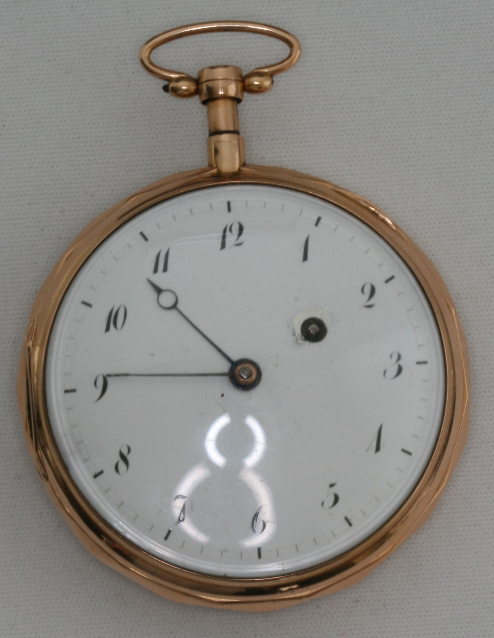 open faced white enamel dial with Arabic numerals, winding hole to front, the rear cover decorated with radiating panels, brass inner cover