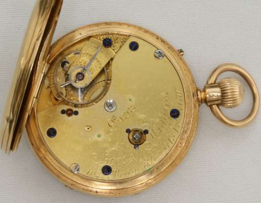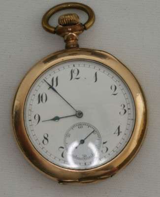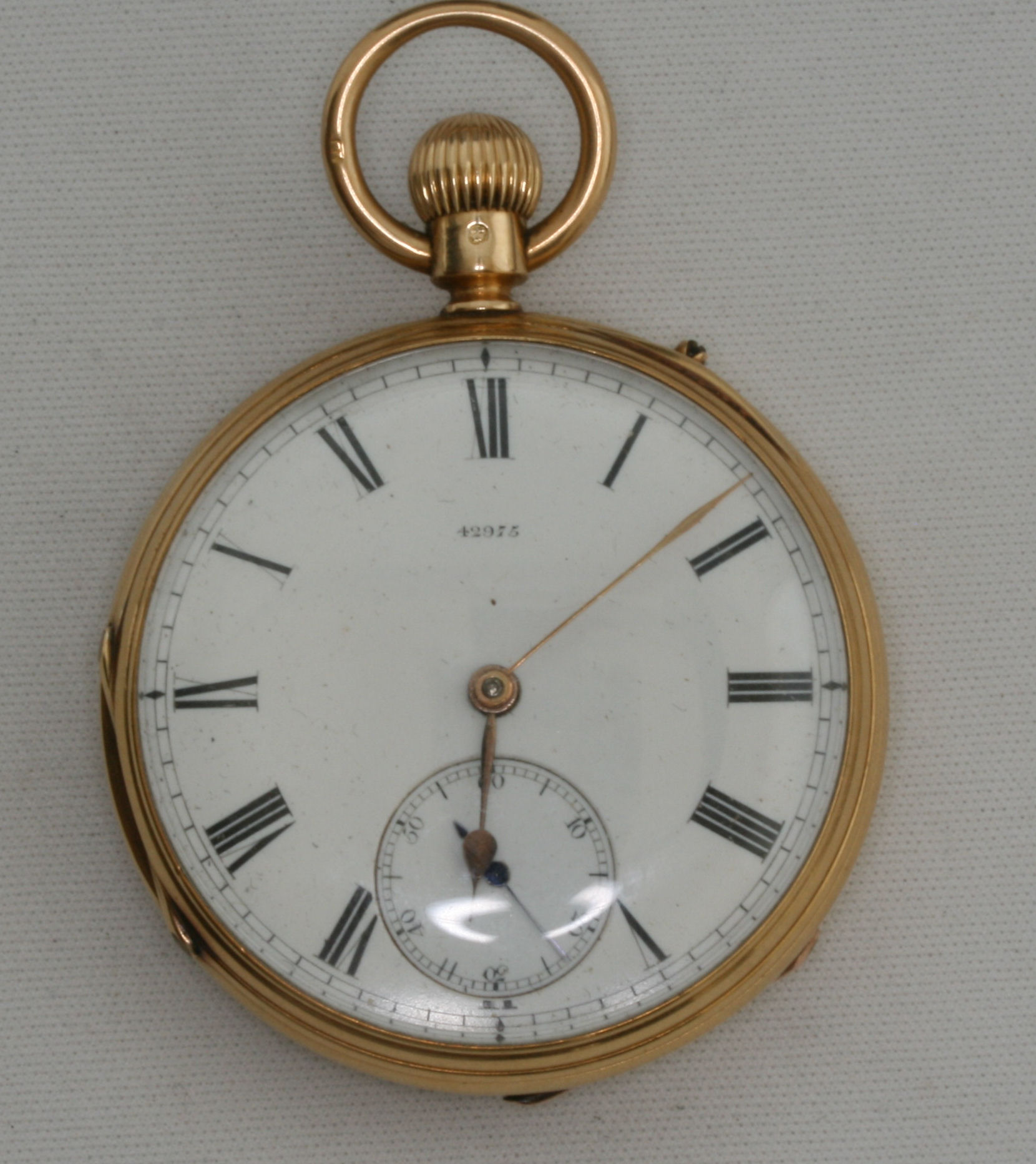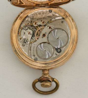 open faced, white enamel dial with Roman numerals, subsidiary seconds dial, numbered 42975, the lever movement inscribed James Higgins, Glasgow, 42975, together with a gold plated cased keyless wind pocket watch, the Waltham "Royal"