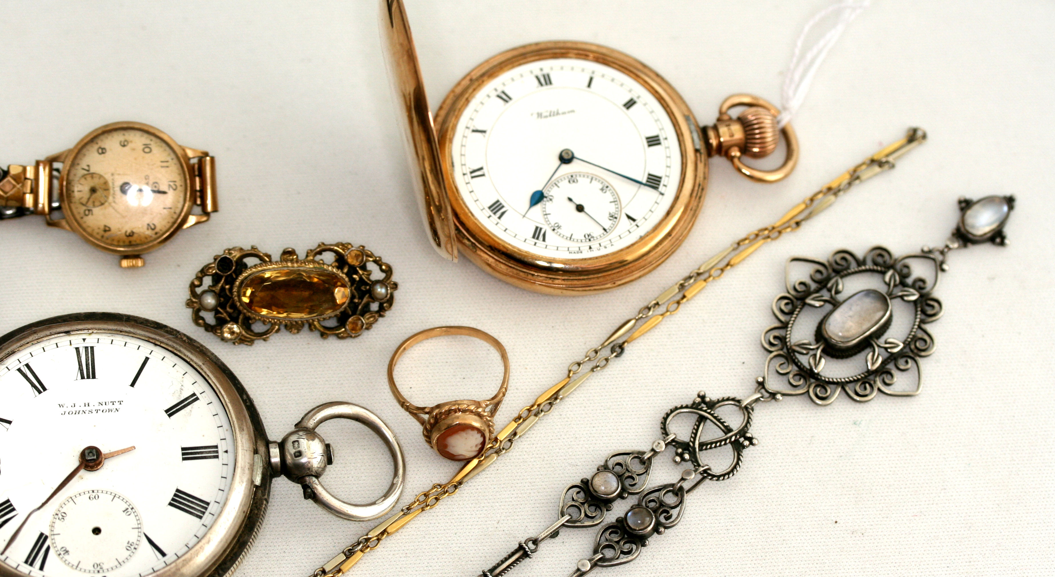 by Waltham, keyless wind in full hunting case, together with a two colour gold Albert; a lady's gold wrist watch; an ornate silver and moonstone necklace; a gem set bar brooch; cameo ring; silver cased pocket watch
