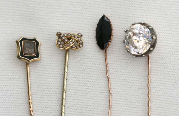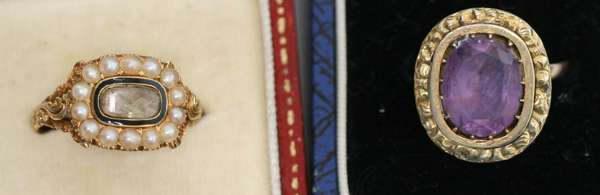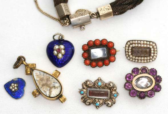 to include; a William IV gold ring set pearl border with enamel detail, engraved to the rear and dated 1836; a Georgian ring set foil backed amethyst paste, chased border; four gem set brooches; hair bracelet with silver mounts; three pendants; five stick pins