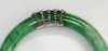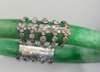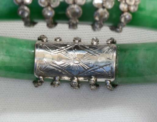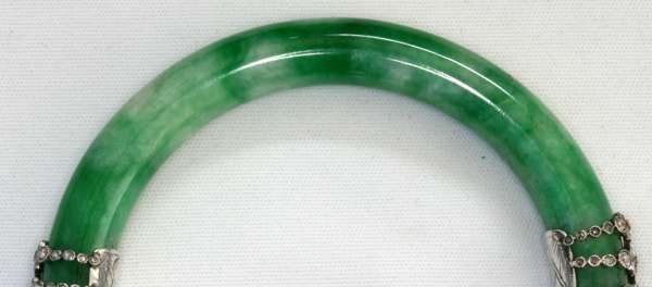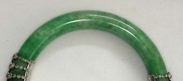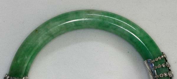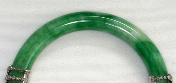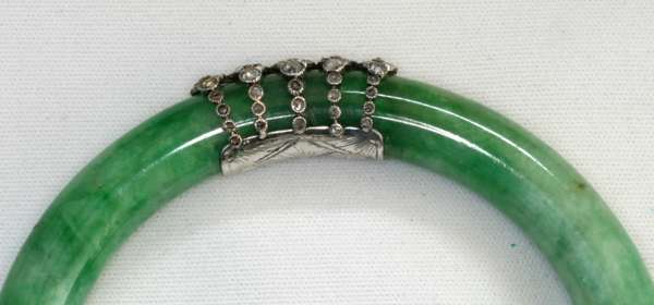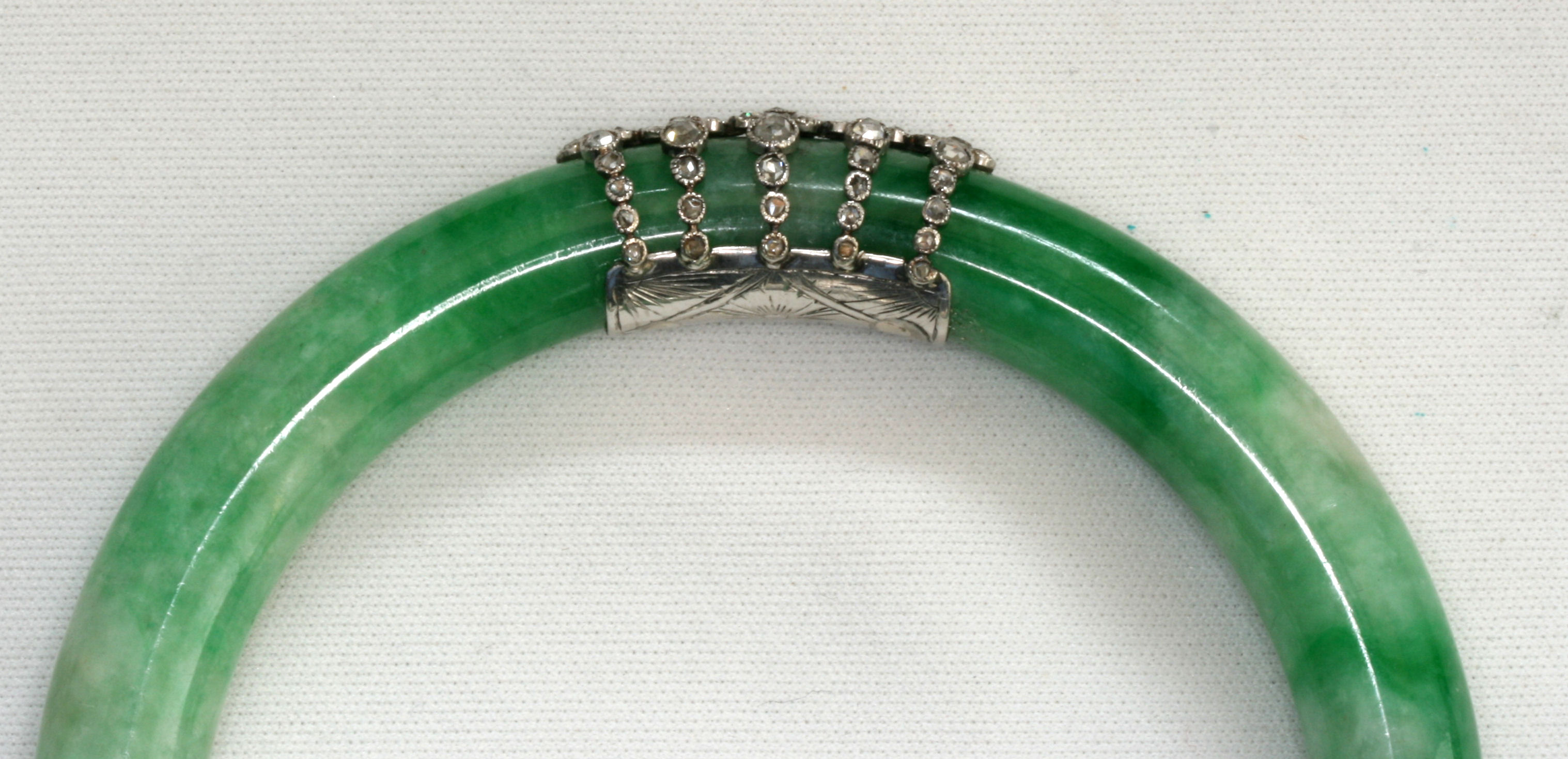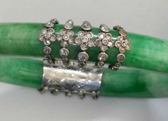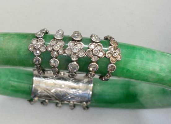 of plain circular section, applied to opposing sides with millegrained floral clusters set with graduated rose cut diamonds, with accompanying Anchorcert Gem Identification Report numbered 1/20296-001, stating that the bangle is found to be Jadeite, measuring 85.62mm diameter and weighing 74.39g total, with no evidence of treatment observed