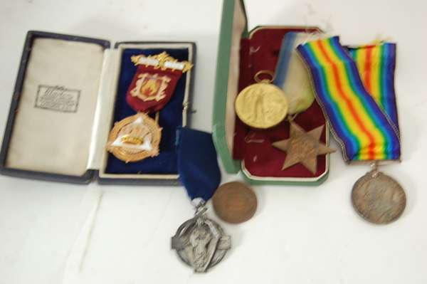 with enamelled clasp and badge aboved two colored gold pendant with enameled centre, in case of issue; together with a small collection of medallion and a WW1 pair to 306038 Pte G READMAN Tank Corp (qty)