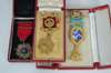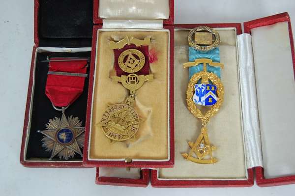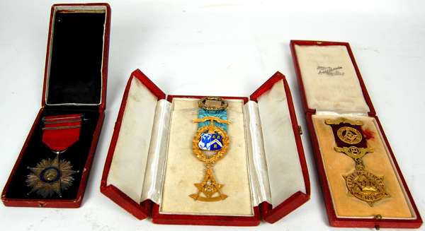 marked 9ct, the square and compass set with diamond suspender from a laurel wreath with enamel panel within, named to LODGE KIRKWALL NO 1250 and on blue silk ribbon; together with another 9ct jewel with yellow and rose gold highlights, on red ribbon and a Bolivian medal with two bars (3)