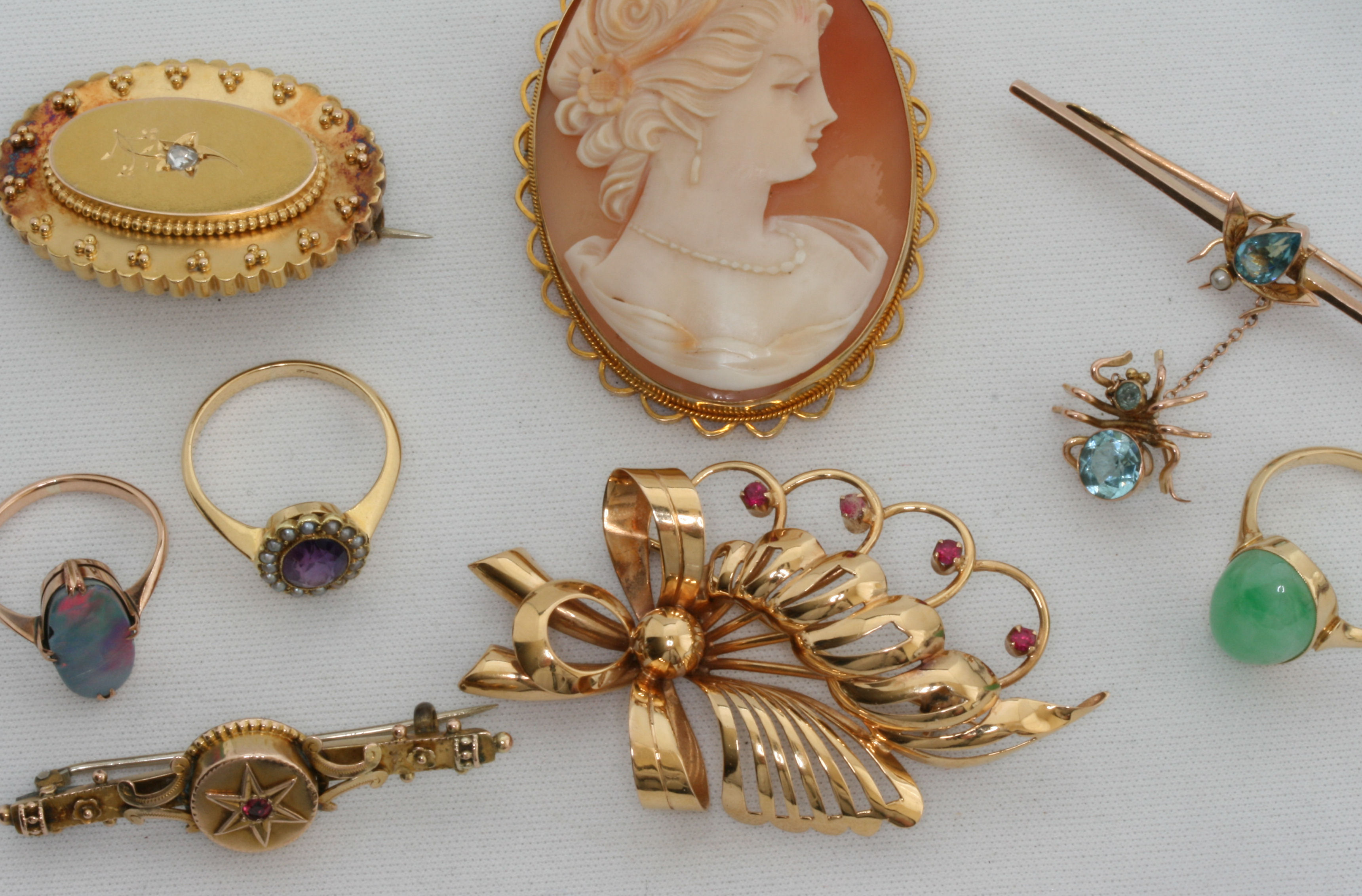 a shell cameo brooch; gem set gold brooch, ruby set bar brooch, diamond set Victorian gold brooch, opal dress ring, hardstone set ring, and an amethyst and seed pearl ring
