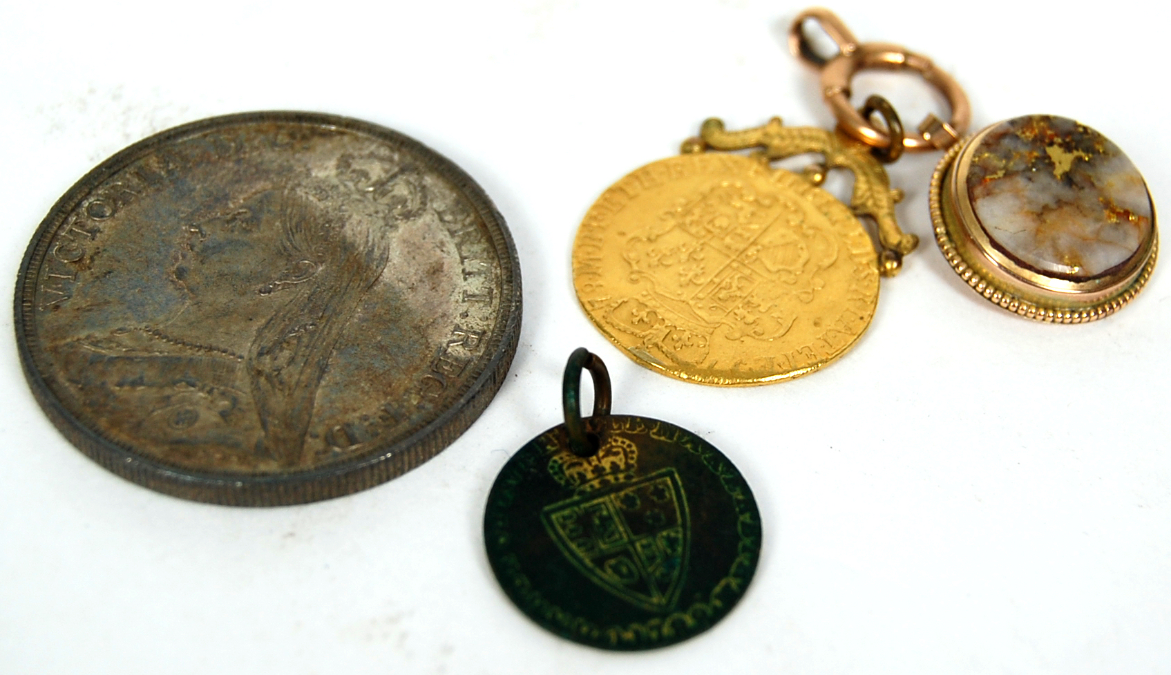 1778 George III, on gilt scroll mount, together with a 9ct gold mounted fob, an 1887 crown GVF (3)