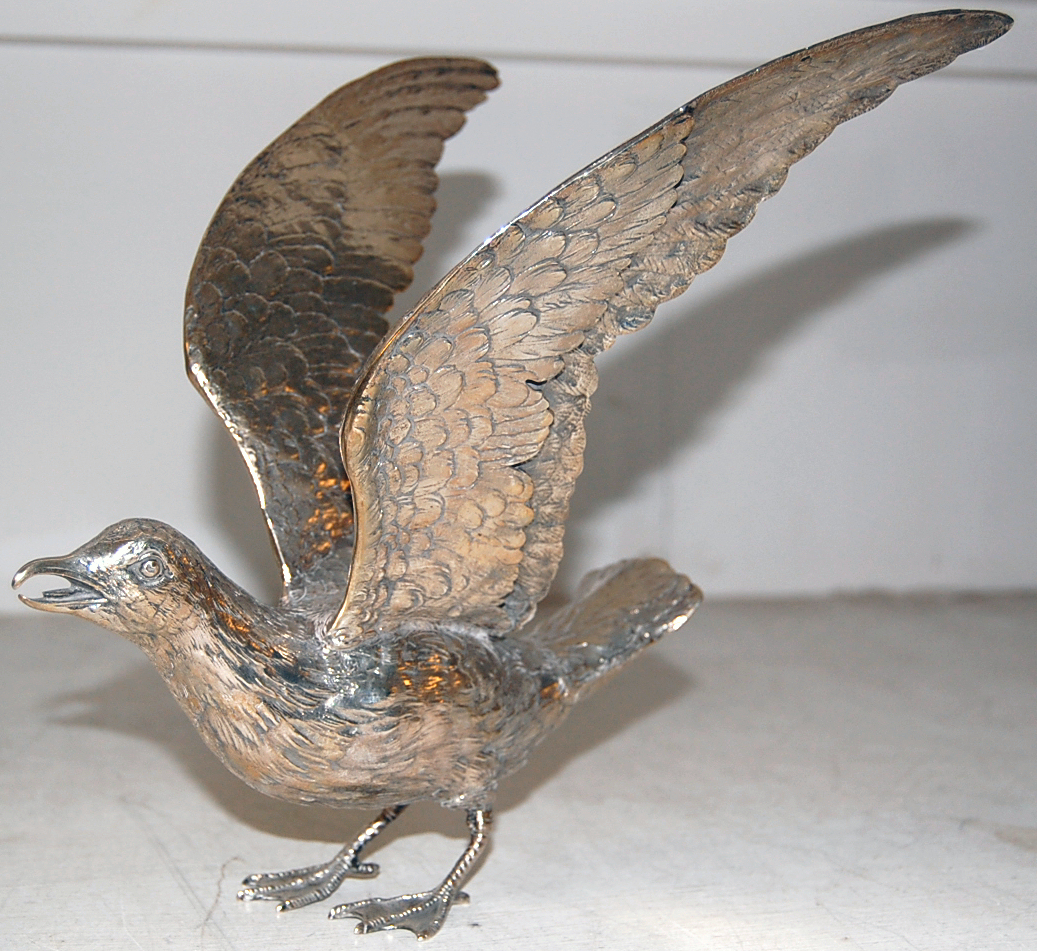 to include, two gallery trays; a pie crust edge salver; mounted glass ice bucket and tongs; bottle holder; five various bird models and other smaller items (qty)