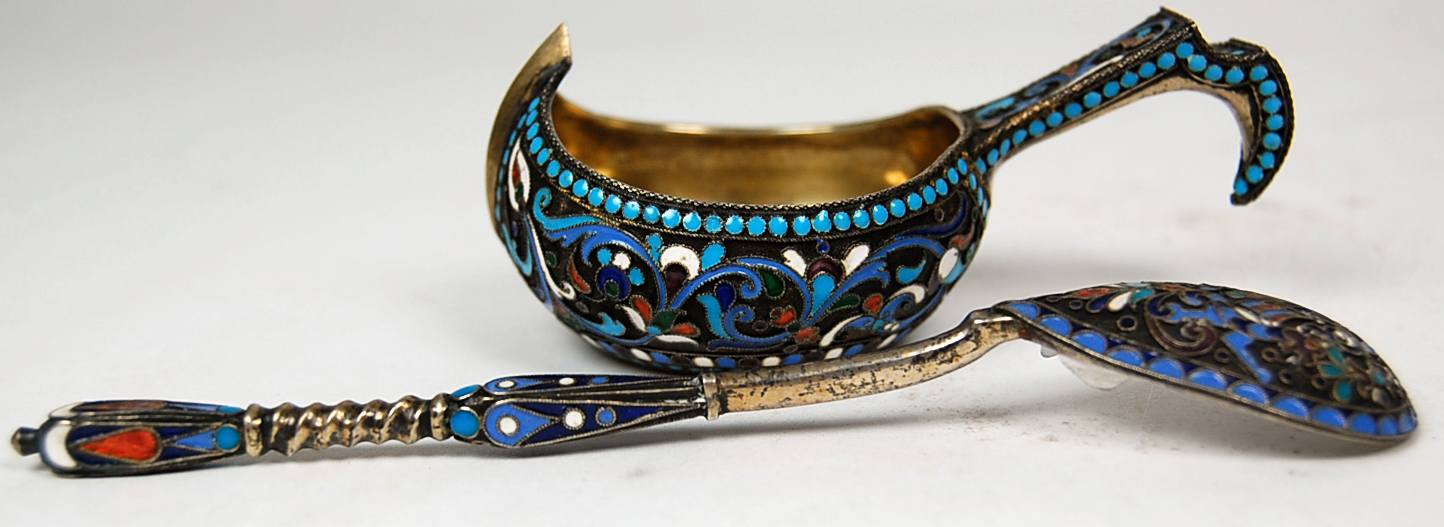 circa 1920, maker's mark indistinct, of traditional form with champlevé decorated body in blues red and white