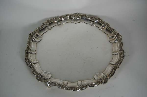 Birmingham 1968, of shaped circular outline with foliate scroll border with shell detail, raised on three scroll feet