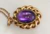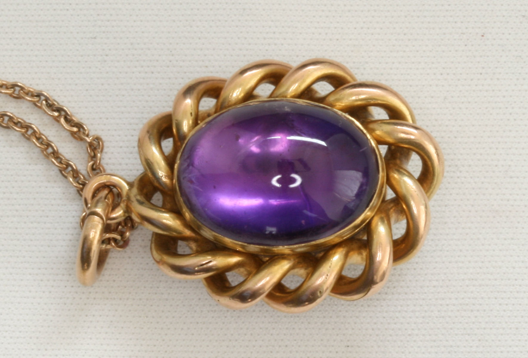 the shaped oval pendant collet set to each side with an oval cut amethyst cabochon, hinged to one side opening to reveal a locket compartment, within a scroll surround, suspended from a fine belcher link chain