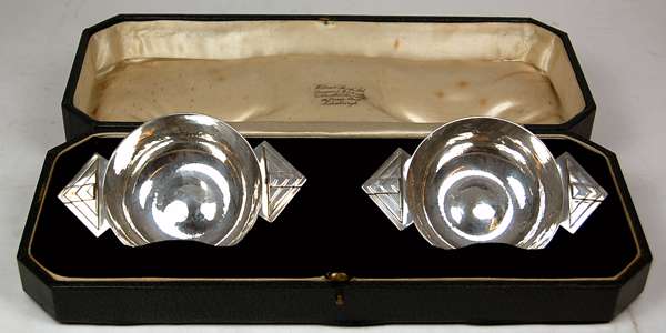 R E Stone, London 1934, also with signature mark, the shallow bowls with lightly hammered finish and twin stepped triangular lugs, in fitted Wilson and Sharp of Edinburgh case; together with a pair of 'quaich' bon bon dishes with pierced borders to bowls and lugs, in fitted case (2)